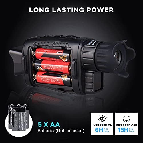 💧IP56 Waterproof & Durable – The military grade night vision goggles with high-grade IP56 waterproof certification, the sturdy case can fully protect the camera from rain, sand and dust. The night vision is powered by 5 AA batteries (not included), and the work time is up to [6] hours with IR illuminator on or [15] work time with IR illuminator closed.