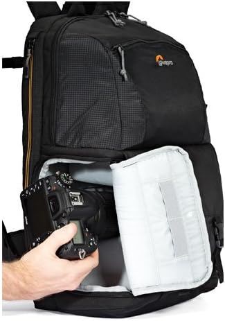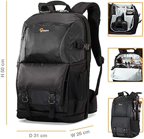 Secure the Fastpack backpack to a rolling trolley via the compression straps, and keep valuable gear protected from the elements with the built-in All Weather AW Cover. The padded and removable waistbelt offers extra comfort during use, as well as the ability to stash during travel. A tall, stretch-mesh side pocket holds a water bottle or tripod base (secured with side compression straps). The Fastpack BP 250 AW II fits a DSLR with attached lens (such as Nikon D810 with up to 70-200mm f/2.8), 2-3 extra lenses or flashes, up to a 15″ laptop plus tablet, a large smartphone, headphones, hard drive, keys, etc.
