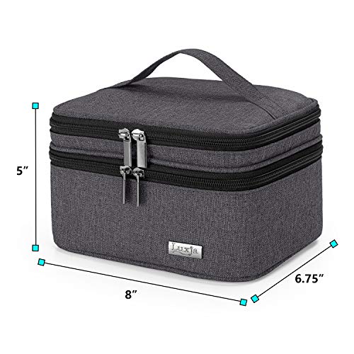 Double Layer Design. Several pockets and elastic bands for storing empty essential oil bottles, openers, droppers, funnels and other small accessories. A large compartment (with adjustable bottle dividers) holds up to 30 bottles of essential oils (5ml to 30ml, also fits for roller bottles, up to 3.5″ tall).