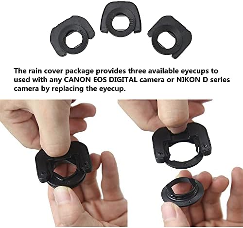 The rain cover package provides three available eyecups to used with any CANON EOS DIGITAL camera or NIKON D series camera by replacing the eyecup.