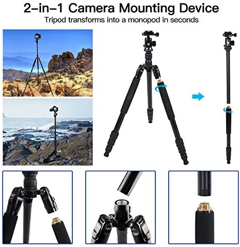 Quality Portable Fit: Fold up the legs 180° for a compact fit to store and carry.Multiple Working Heights: Stretch the center column up or down to adjust the working height or reverse it for ultra low angle and macro shots.Providing dual functions: Easily convert the detachable leg into a monopod for extensive shots.Auxiliary Shooting Components: Connect a photo accessory via the included 1/4-20 accessory port. And with the included stainless metal spikes, stand firm on a soft ground to shoot steadily.Easy Leg Set-up: The tripod includes the semi-automatic leg angle adjustment buttons and twist leg locks to adjust the spread and length of the legs for different leg height needs.Shoot Beyond Your View: Smoothly pan the head 360° to capture a beautiful landscape panorama shot.