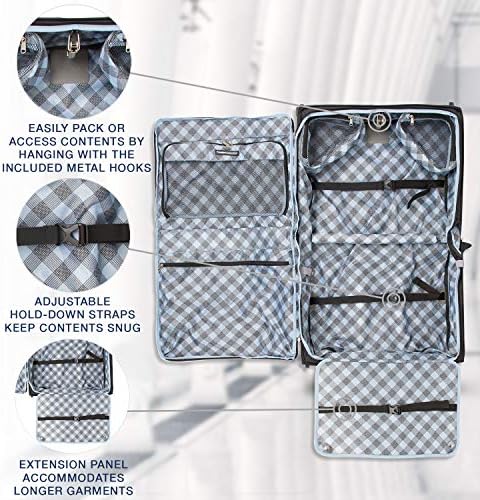 Lay flat design with padded straps keeps dresses, suits and other clothes wrinkle free during travel. Front flap, roomy interior and built in pockets keep contents organized and accessible