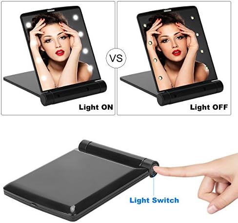 💡 POWERED BY BATTERIES – Lighted handheld mirror is double sided: one with 8 led lights, lighting powered by 1 x 12V 23A Battery (included), another side without lights for not too bright. Dimmable, Light-Up for when you are in a dim room and have bad lighting. Added convenience whether you are in a hotel room or in a limousine. Use this folding pocket mirror as an ideal make-up accessory.